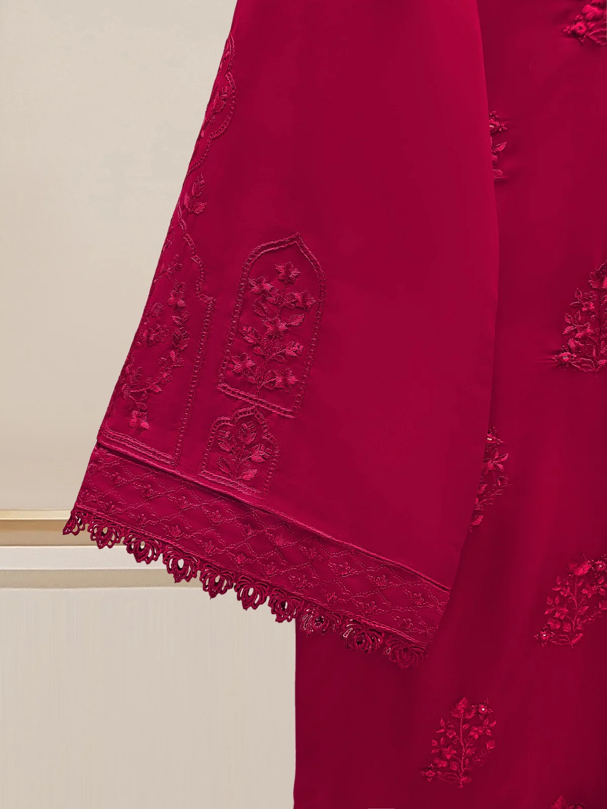 Embrace the festivities of the season in style with our maroon two-piece accented with intricate embroidery. Our exquisite suit is crafted in swiss voile fabric, embodying elegance and grace. The ensemble is paired with dupatta.