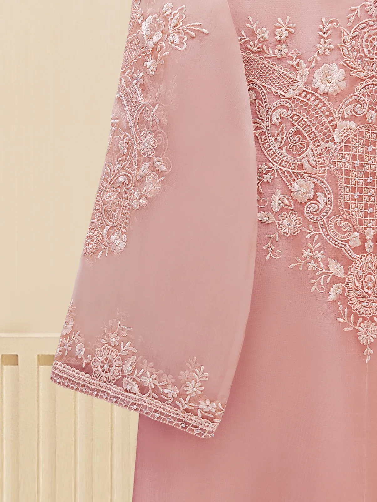 Elevate your style with our pink embroidered organza straight shirt crafted with utmost care and attention to detail. The shirt features intricate embroidery on the front and sleeves, adding a touch of timeless charm.