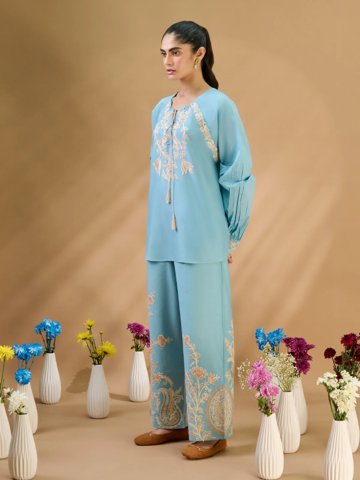 A celebration of feminine beauty and a empowerment, this sky blue co-ord features raglan-cut, bishop sleeves, gently gathered tie-up neckline and exquisite ARI embroidery depicting birds and tulips, telling a story of strength and love.