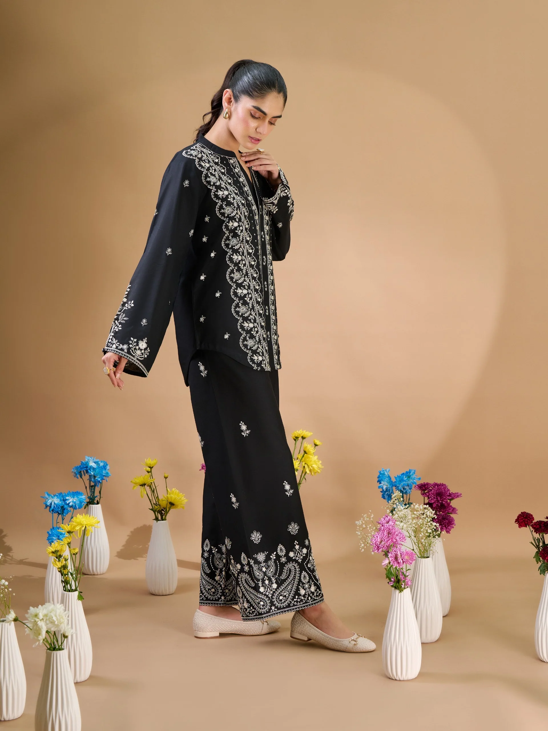 Luxurious french lace-inspired embroidery, a breathable cotton fabric and thoughtful design details make this co-ord set with slit sleeves and front buttoned shirt the ultimate choice for formal house events or outdoor.Â