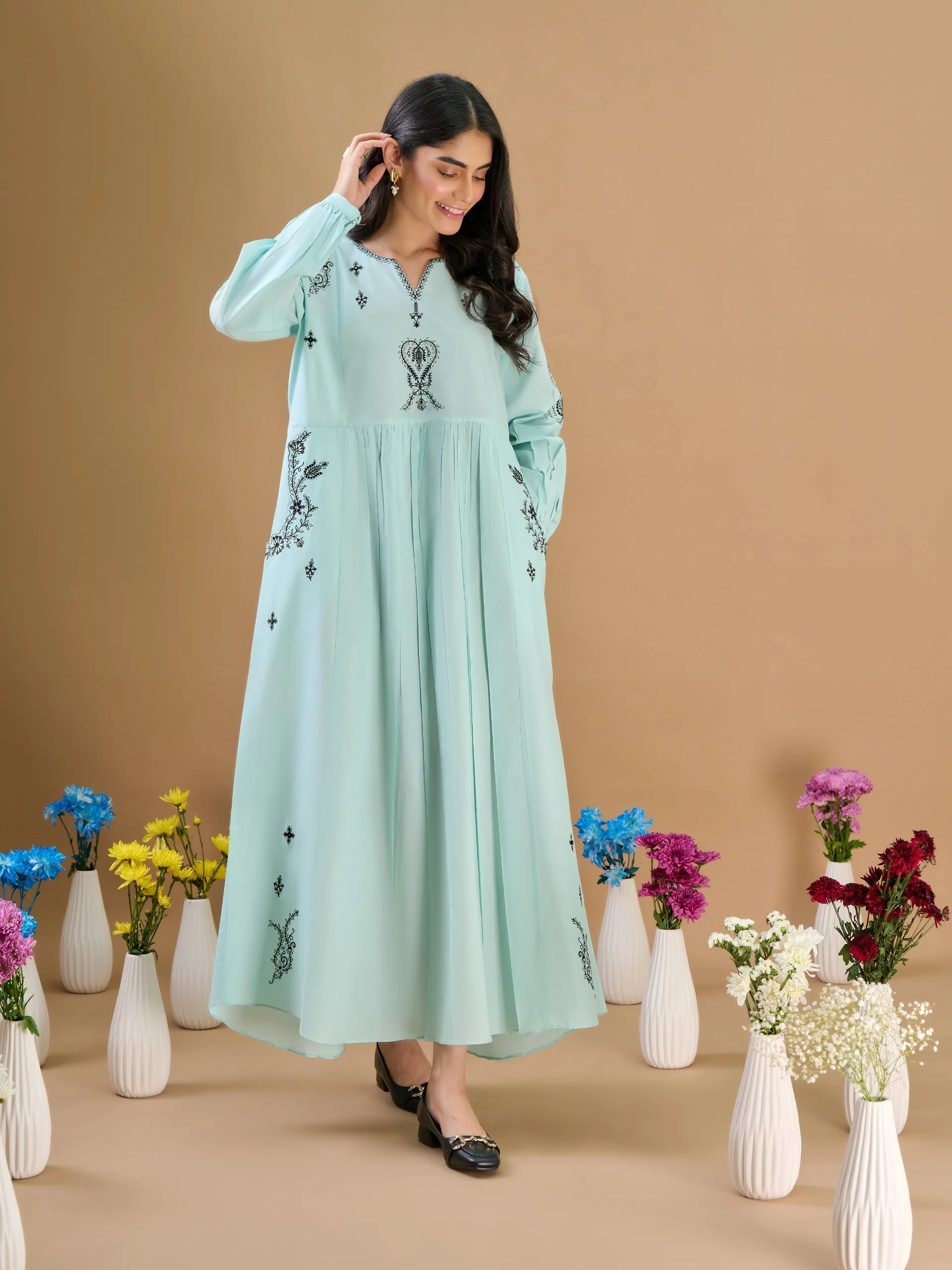 This Kasuti embroidered dress is a Contemporary yet minimal take on style with refined gathers carefully added to waist panel and the hem of sleeves. It features side pockets with embroidery detail this timeless and comfortable dress adds versatility to year wardrobe.