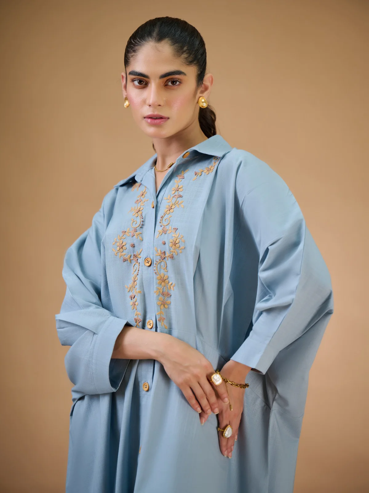 Effortlessly chic in this front open draped dress, featuring a relaxed trendy fit and exquisite hand embroidered details which adds a ethnic twist to a contemporary design